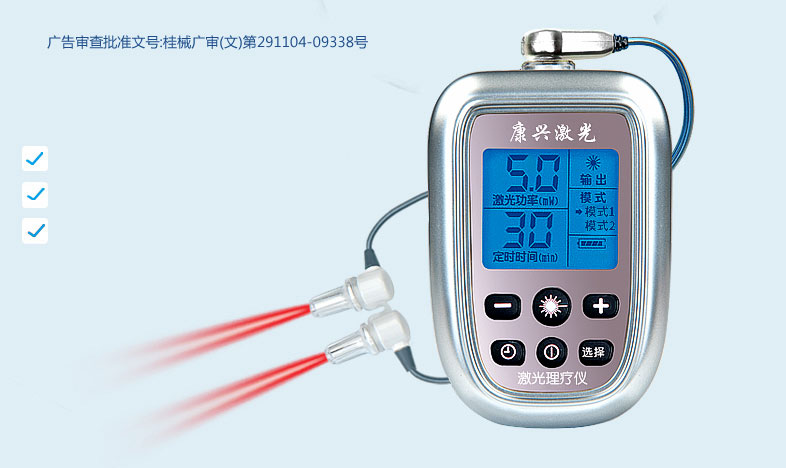 亚健康状态的人,大多数有"三少一多"和"六高一低"的表现,"三少一多"是指活力减少,反应能力减少,适应力减少和疲劳增多;"六高一低"是指高疲劳,高体重,高血压,高血脂,高血糖,高血粘度以及免疫功能偏低。以上症状均是血液不健康的表现。我们生产的半导体激光低频治疗仪正是运用激光能量的生物刺激作用及低频脉冲电流分别作用于鼻腔黏膜、人体体表穴位或患处,配合饮食、心理、运动、药物等综合治疗,将疾病消灭于萌芽之中,将有效地对付危害人类的大敌—亚健康,使我们从亚健康状态又恢复到健康状态。